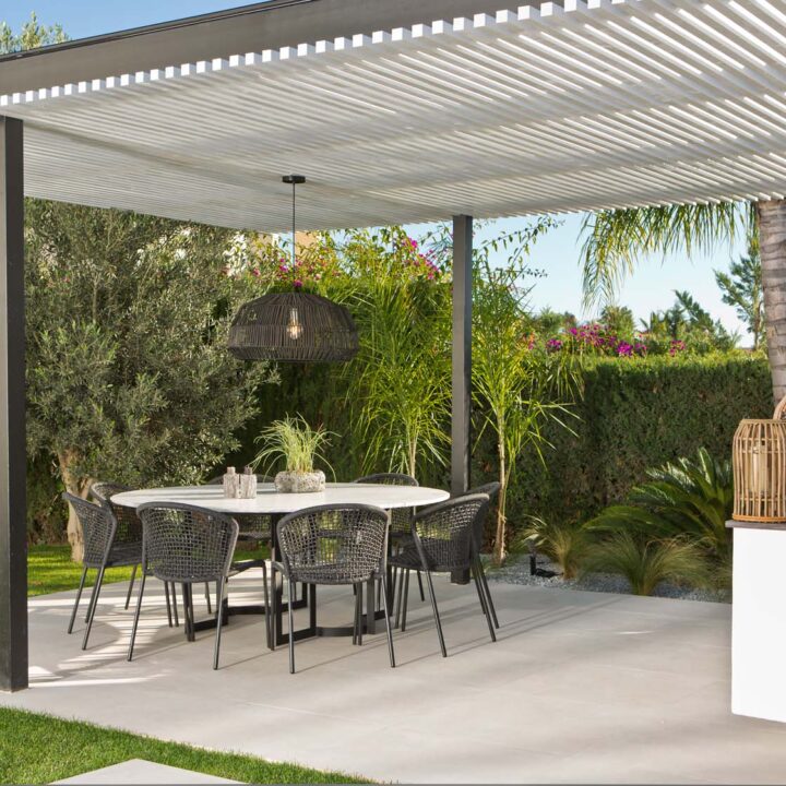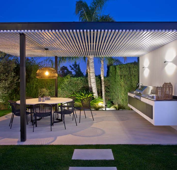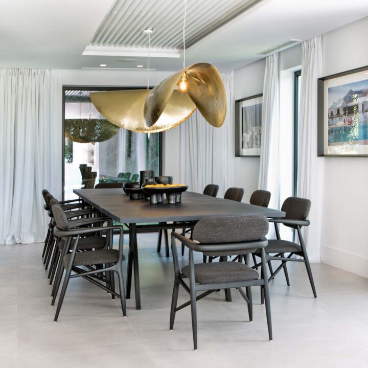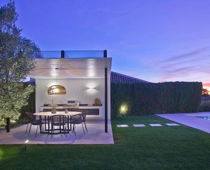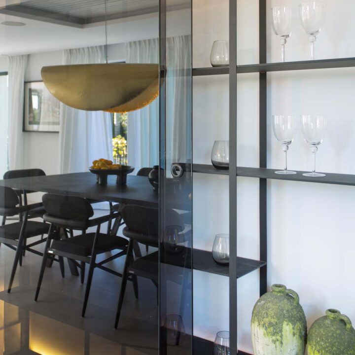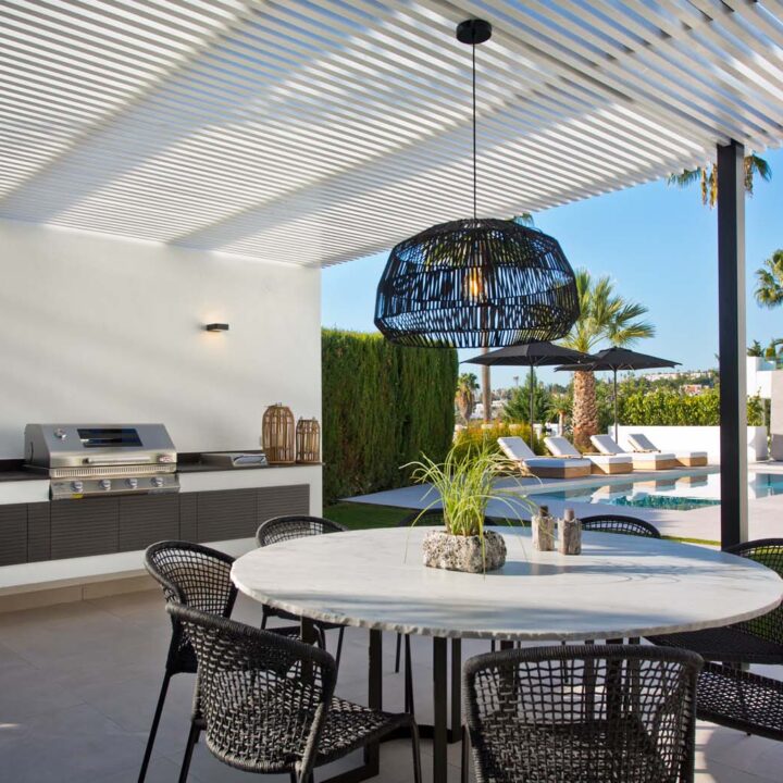 LARGE OPEN WINDOWS that is showcasing the beautiful outdoor dining, garden and pool. From here you also have open views to the golf course and sea. The villa is south facing and has sun all day. Connected closely to the kitchen there is a gazebo with dining and outdoor kitchen where you can enjoy the afternoon sun. On this level you have two guest bedrooms en suite.