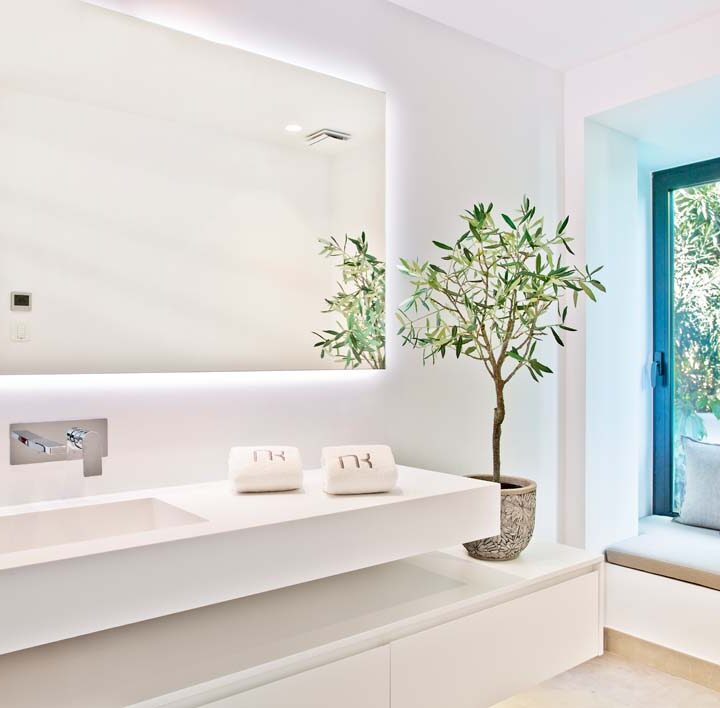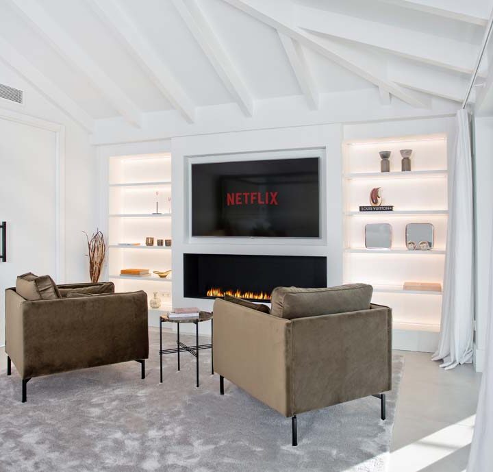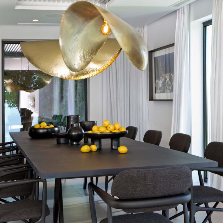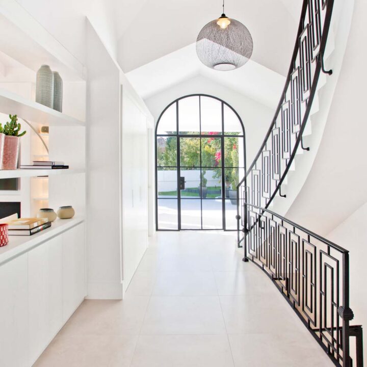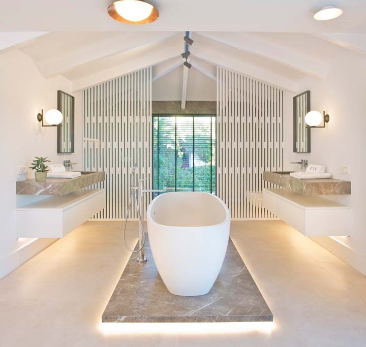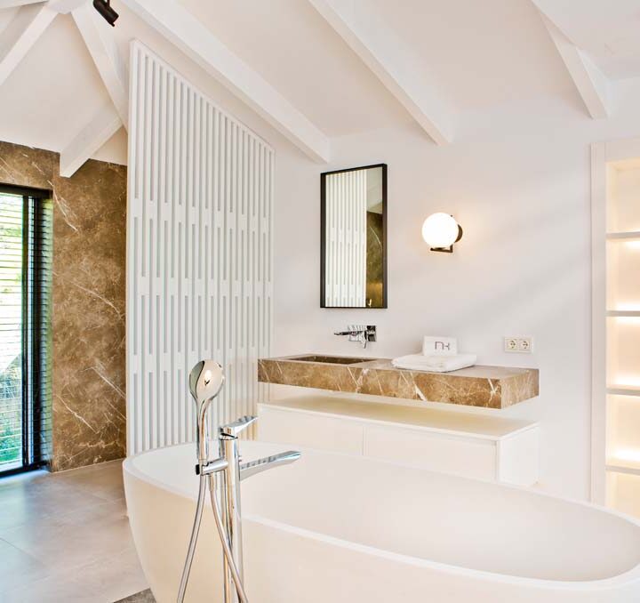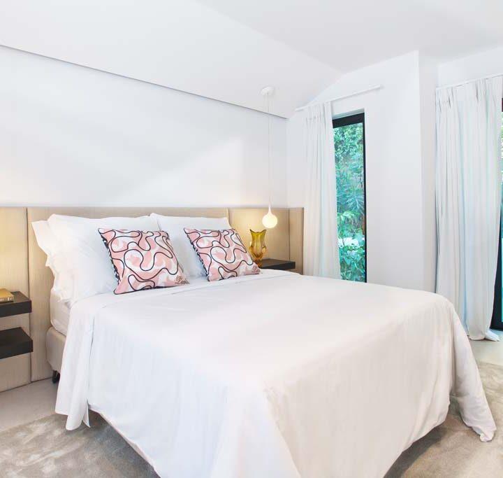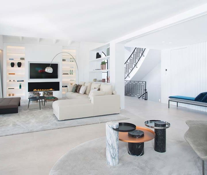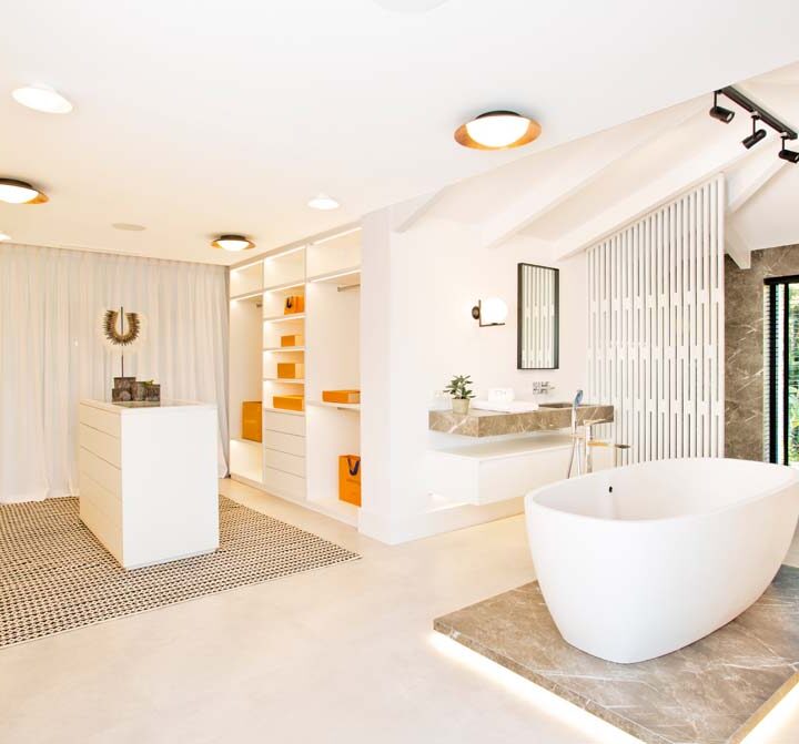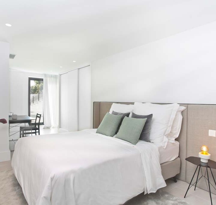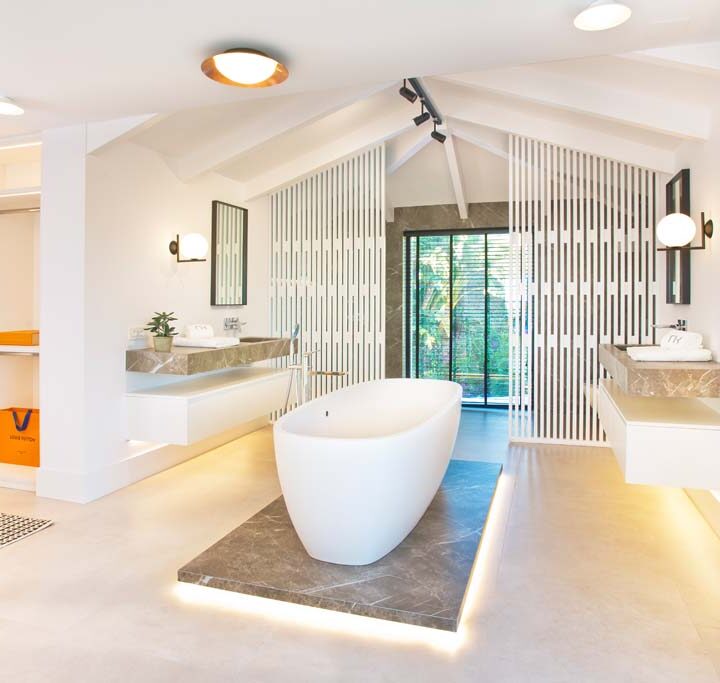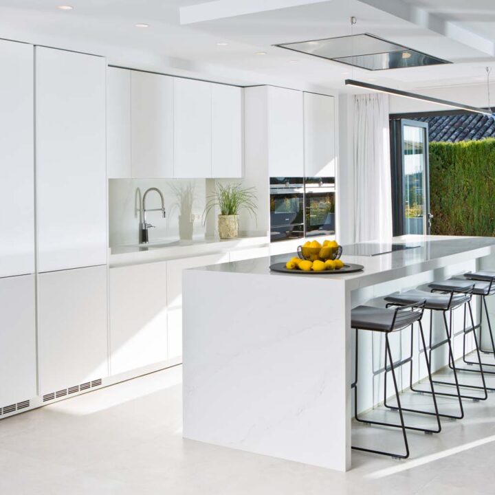VILLA FLORENCE IMMEDIATELY welcomes you with an impressive driveway leading up to the entrance of the home. The entrance has double height ceilings with great natural light and gives you a striking overview of the open plan layout. On this level you have a spacious living area, connected with both dining and kitchen. It has been designed with white wooden details and marble counter tops to create a modern and homely feel.